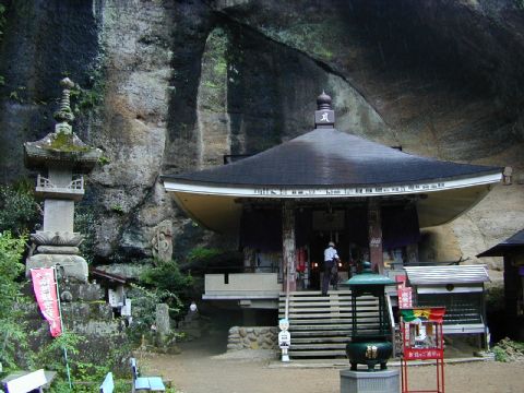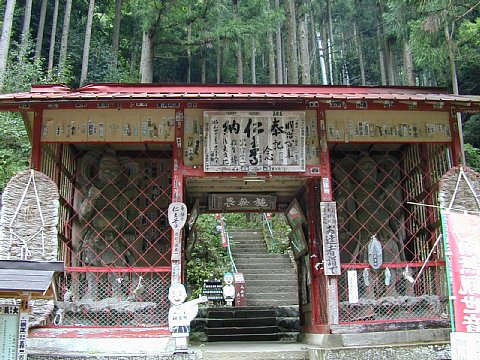 山門にある高さ4mの仁王は石造りとしては大きさ日本一とか。本堂は約300段の石段を上った所にある。観音堂は絶壁の前に立ち、左手に聖浄の滝、さらに左手の岸壁に摩崖仏(写真3枚目)がある。